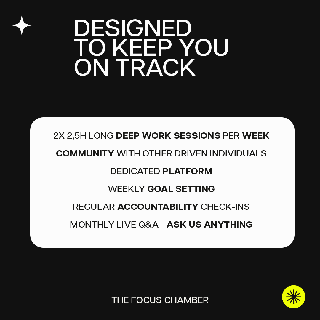 At its core, the Focus Chamber stands on three pillars: Focus, Work, and Community. The mechanisms are simple: regular Deep Work Sessions, a platform for connection and accountability, and a container designed with intention. No energy leaks are tolerated here. Everything has purpose and points in one direction: great work